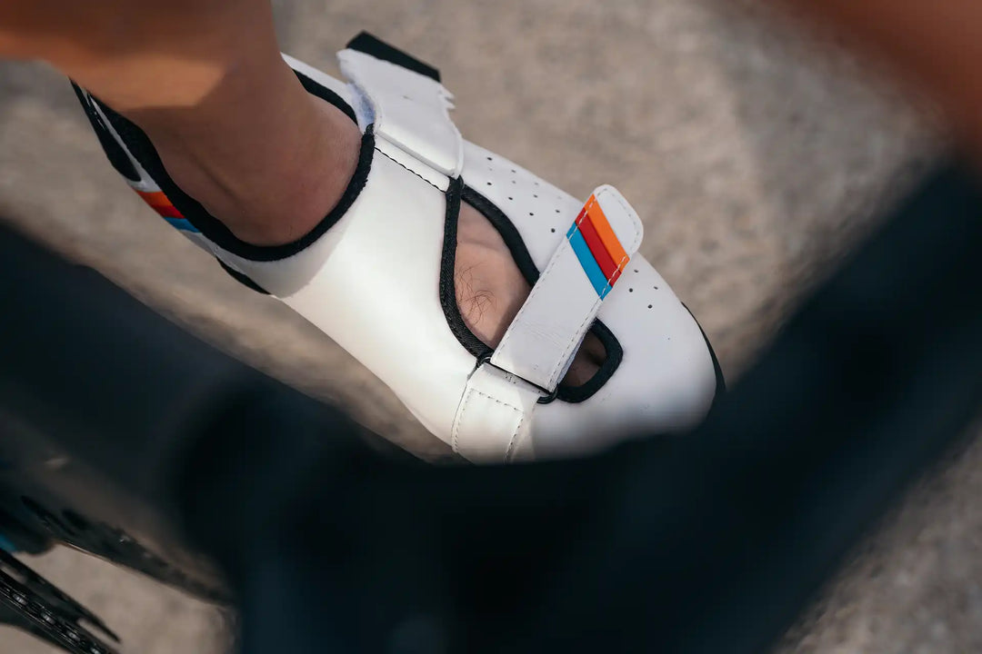 Der Schuh verfügt über verschiedene Befestigungsmöglichkeiten für Gummibänder, mit denen du ihn an deinem Rad befestigen kannst. So kannst du selbst die optimalste Position wählen, mit der du fliegend durchstarten kannst. Du kannst den Klettverschluss des Schuhs einfach in eine offene Position bringen, was auch hilft, mit dem Fuß leicht hineinzuschlüpfen.