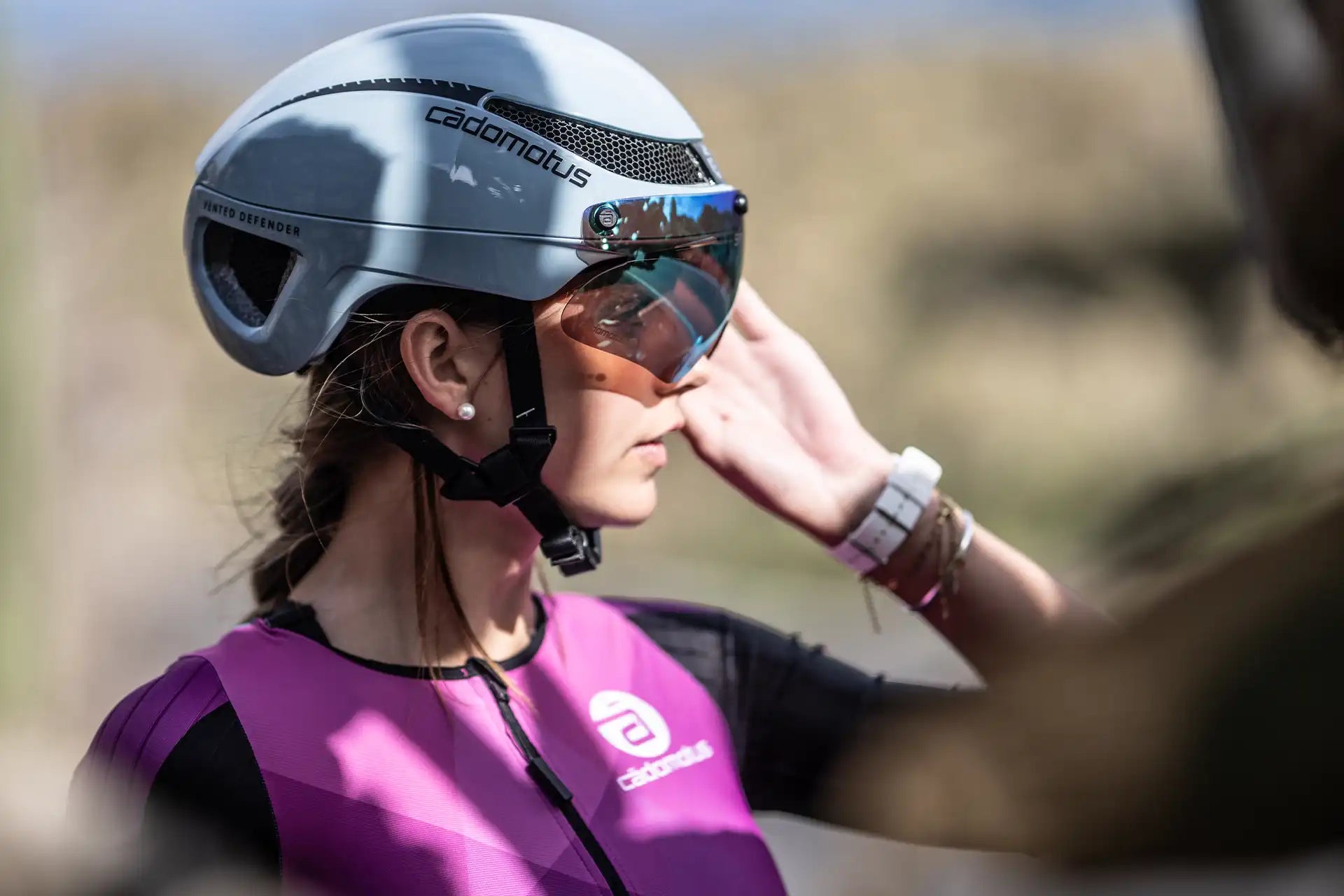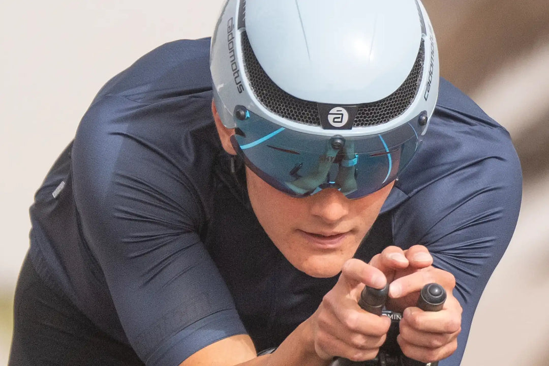 Der Cádomotus Omega-Helm wurde in Kombination mit den Aerospeed-Linsen entwickelt. Diese präzise Passform folgt den aerodynamischen Linien. Die Linsen klicken mit Magneten um die Stirn. Neben der klaren Sicht lässt sich das Objektiv auch im Handumdrehen drehen und abnehmen.